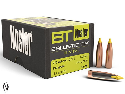 >>The more you hunt, the more you start to realize how unpredictable and unforgiving nature can be, which is why we engineered the Ballistic Tip Hunting bullet to be very predictable and extremely forgiving. >>Whether you're after whitetails, blacktails, mulies or pronghorns, Ballistic Tip bullets deliver the kind of accuracy, consistency and down-range punch required for putting down that buck in any situation. The combination of performance and versatility that Nosler has built into these bullets has resulted in over 25 years of successful hunts for sportsmen across the country - and around the world. >>These bullets deliver the accuracy, consistency and down-range punch required for clean kills in all situations. These flat-shooting, wind-defying bullets utilize ballistic-designed boat-tails and polymer tips to increase long-range efficiency and protect against tip damage in the magazine. Unique tapered jacket provides controlled expansion at all practical ranges and velocities. >> <>Nosler Ballistic Tip: Streamlined polymer tip, color-coded by caliber, resists deformation in the magazine and initiates expansion upon impact. <>Fully-Tapered Jacket and Special Lead-Alloy Core: Allows controlled expansion and optimum weight retention at all practical velocity levels. The heavy jacketed base prevents bullet deformation during firing. <>Heavy Jacketed Base: Acts as a platform for large-diameter mushroom. <>Ballistically Engineered Solid Base: Boat tail configuration combines with the streamlined polymer tip for extreme long-range performance and for easier loading.